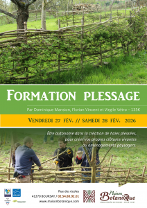 La Maison Botanique propose des sessions de formation à la technique du plessage une fois par an dans le courant des mois de février/mars ou sur demande. Ces formations d’une journée permettent de mettre en pratique la technique du plessage percheron mais aussi d’appréhender les différentes variantes régionales permettant ainsi d’ouvrir le champ des possibilités offertes par ces techniques. Une visite guidée du site permet enfin de découvrir les différents modes de gestion d’une haie plessée et des trognes et d’entrevoir ainsi l’étendu des situations pour lesquelles ces techniques présentent de nombreux avantages.